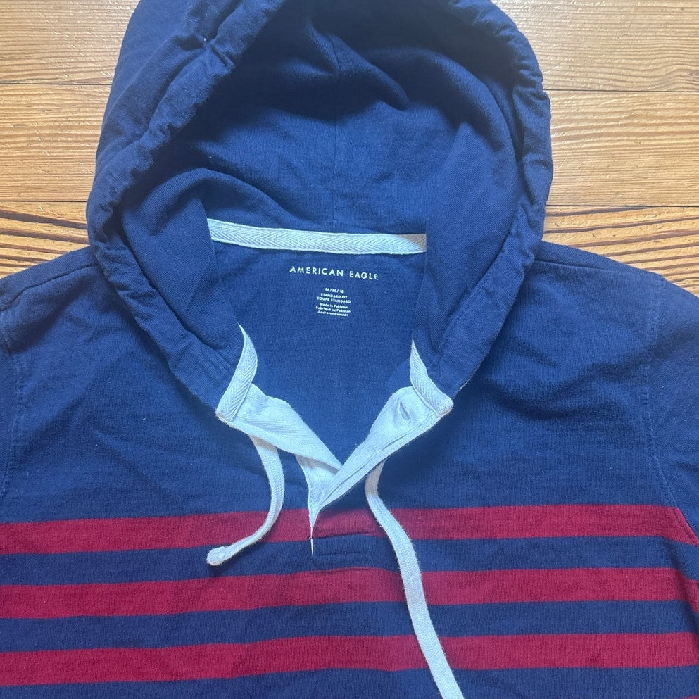 Item: American Eagle blue red striped pullover henley rugby hooded sweatshirt SIZE M