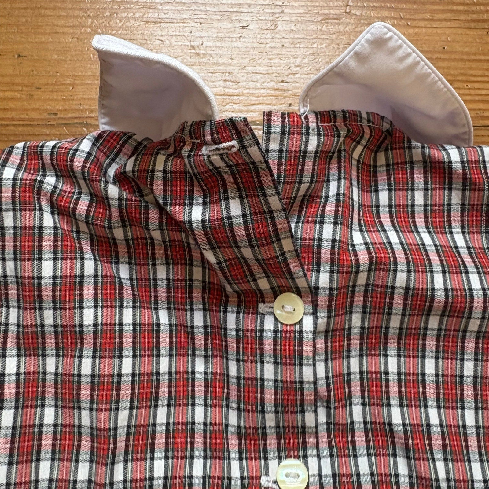 red checkered pattern, Christmas tree smocked front, collar, button closure on back and bottom, cotton