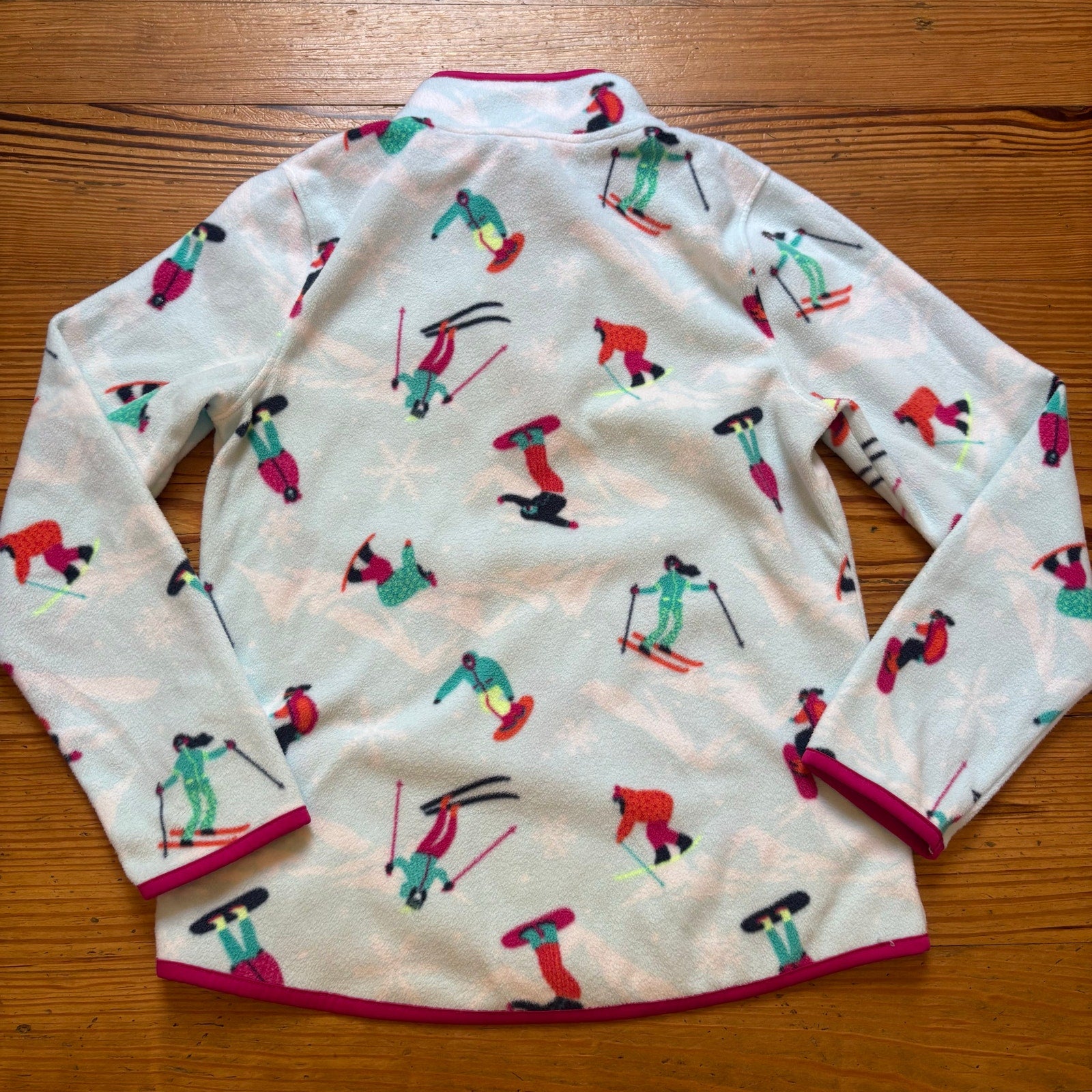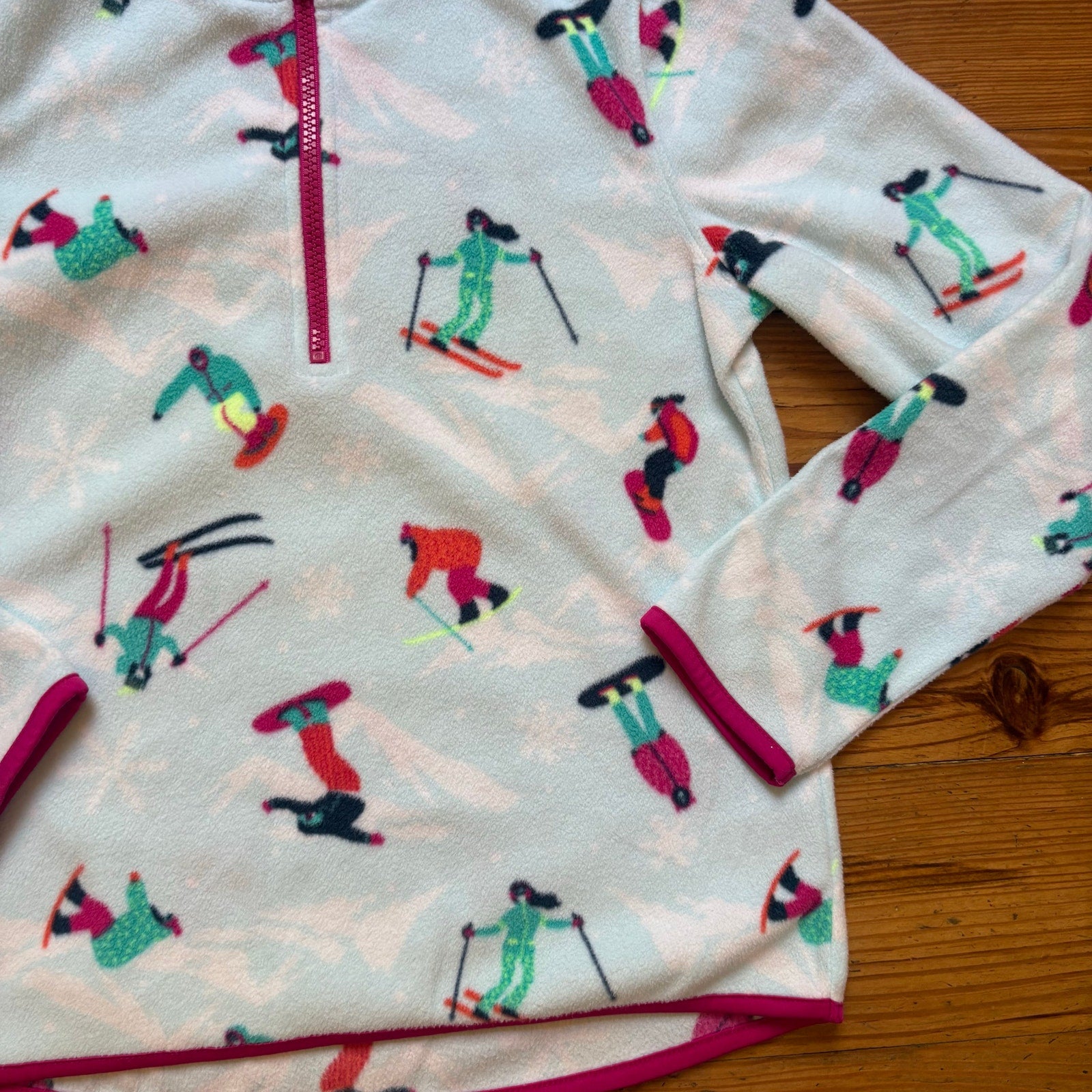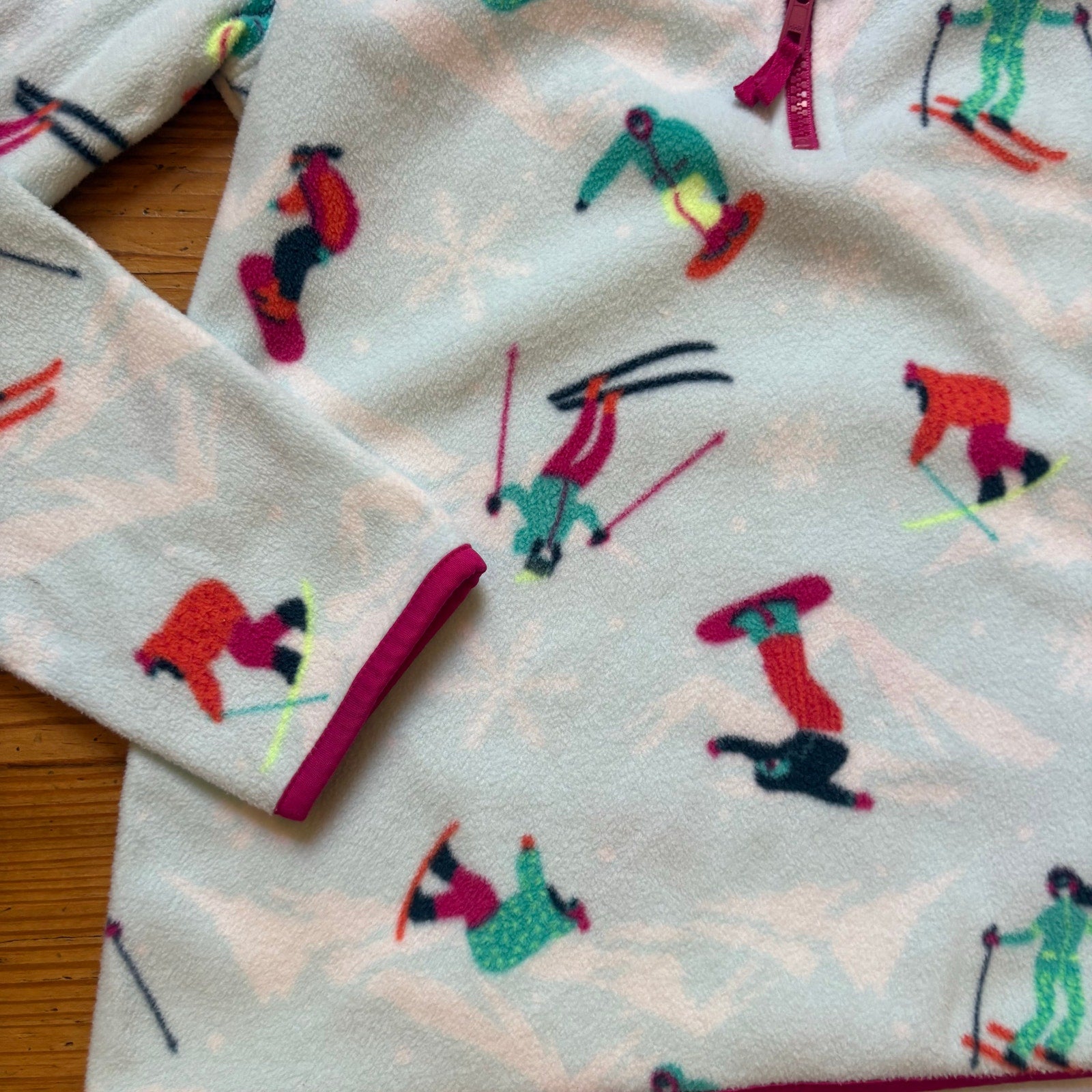 light blue, fleece, skiing winter graphics, quarter zip, recycled poly