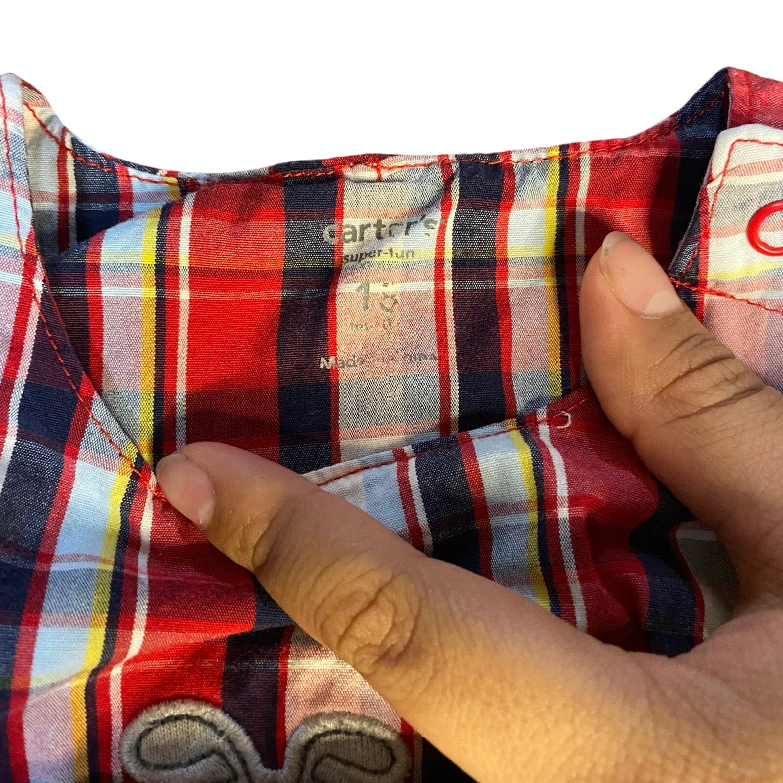 Item: Carter's red blue plaid bulldog sleeveless shorts boys romper SIZE 18M