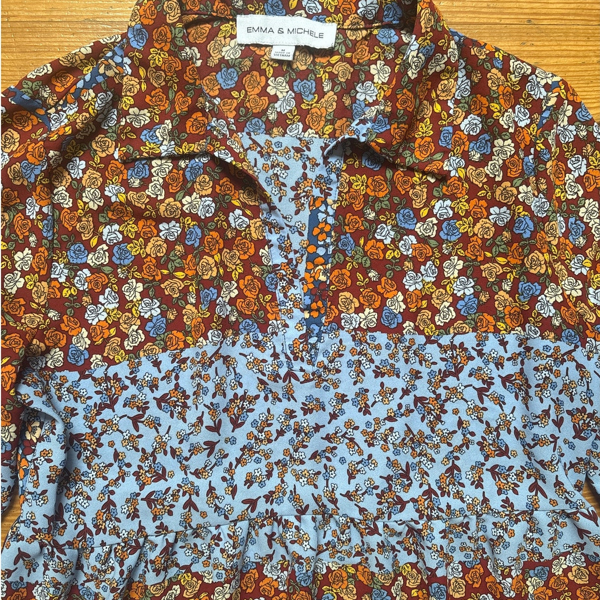 Item: Emma & Michele red blue floral babydoll collar tiered log sleeve dress SIZE M