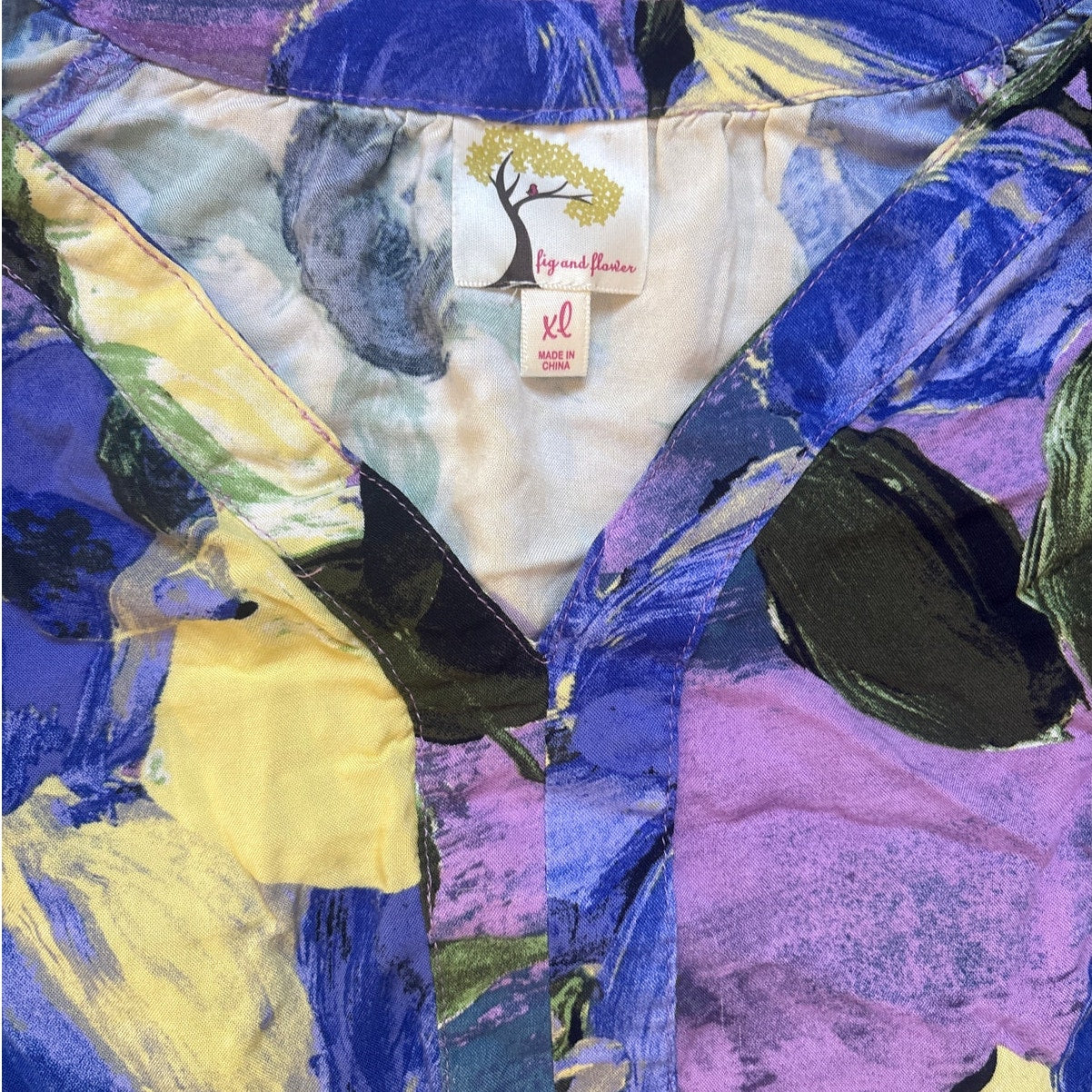 Item: Fig & Flower purple floral ruffle quarter sleeve womens tunic blouse SIZE XL