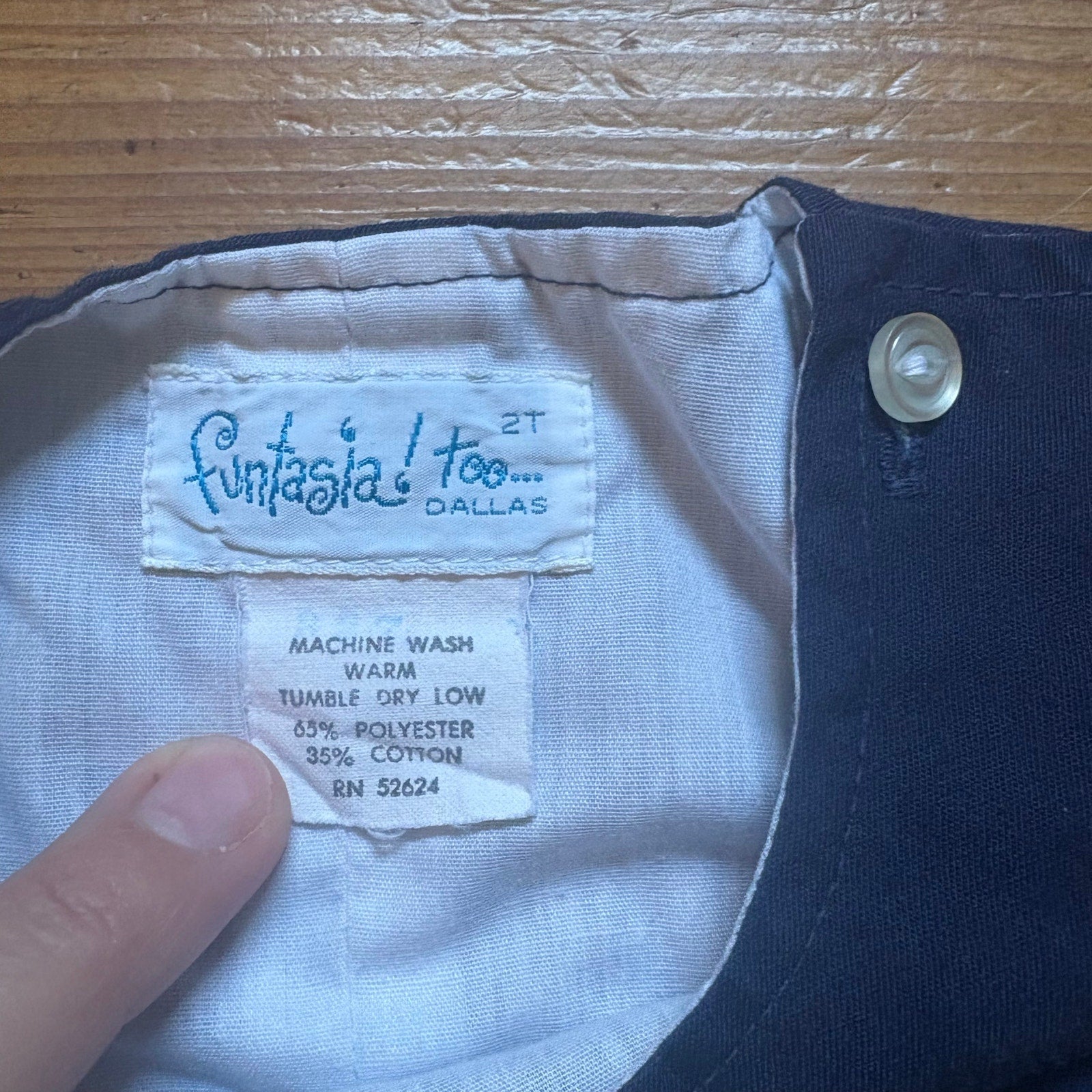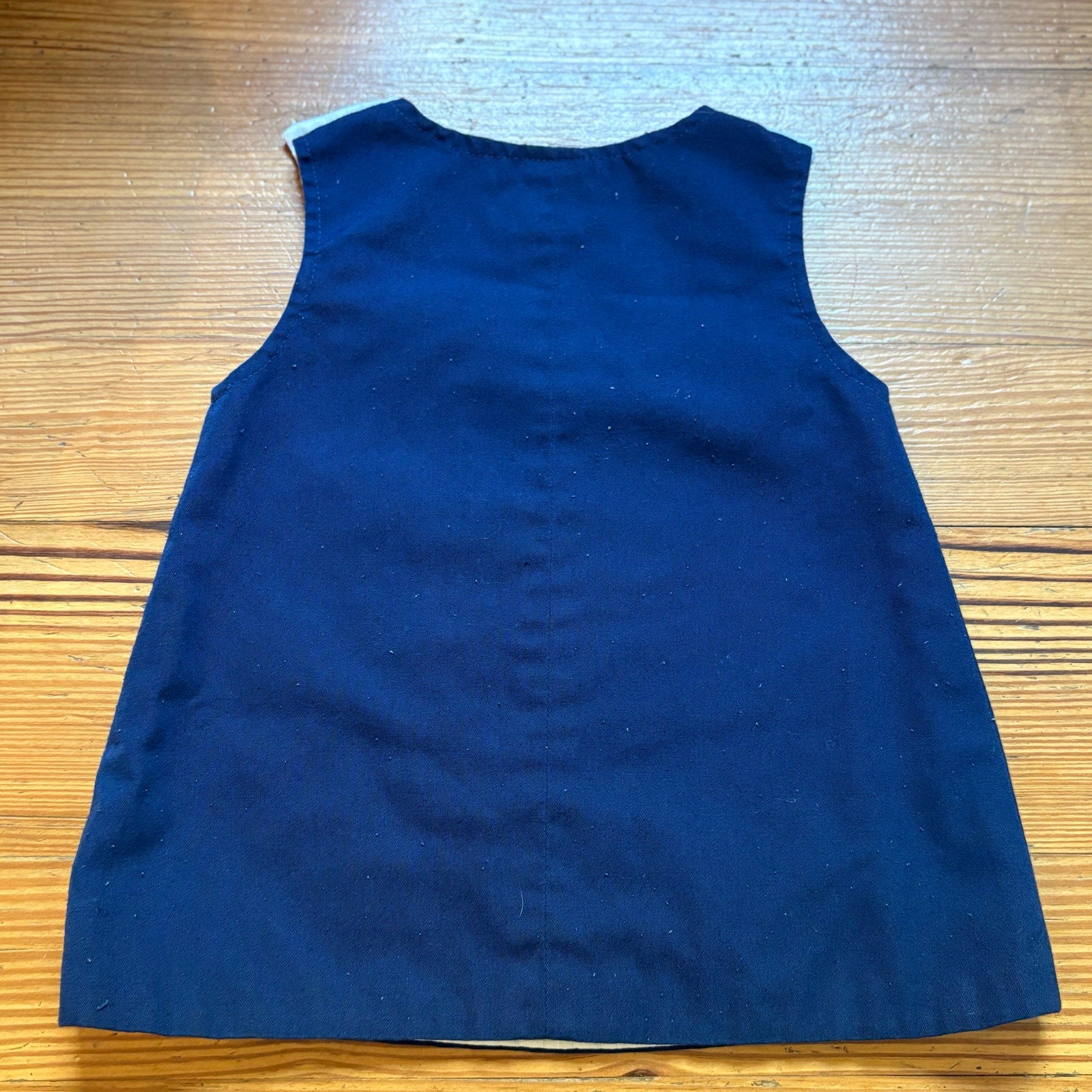 dark navy blue, clown front with balloon embroidered, sleeveless, button overalls, lined poly cotton blend