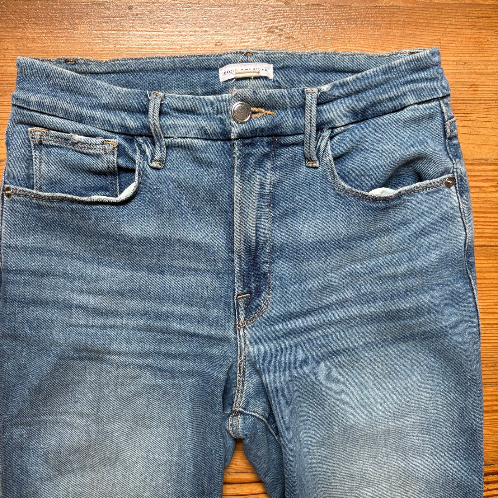 Item: Good American Indigo high rise medium wash distressed ankle jeans SIZE 8