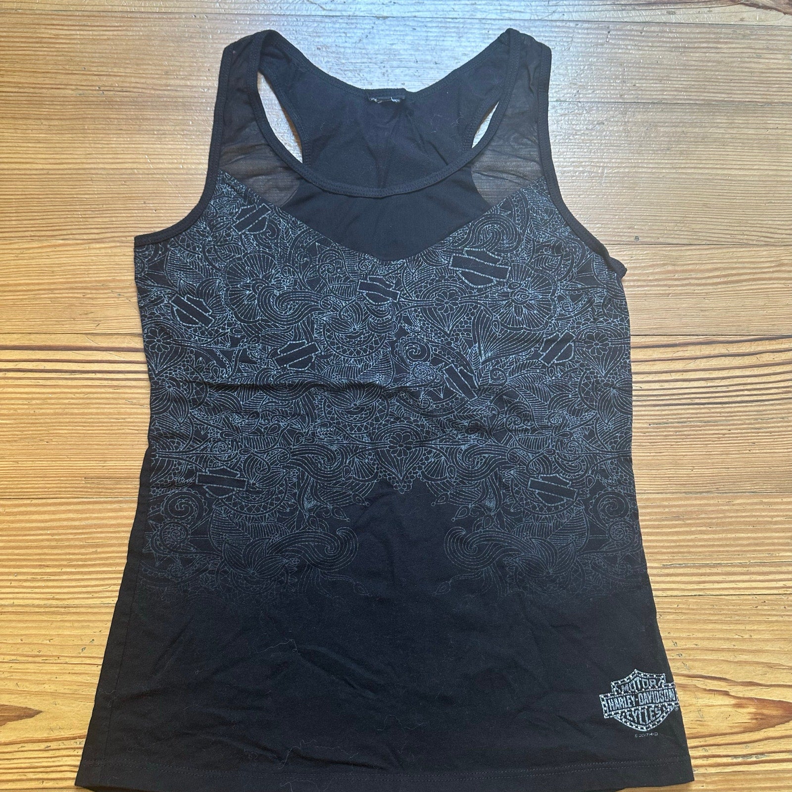 black tank with gray graphic, Harley Davidson design on back, sheer neckline
