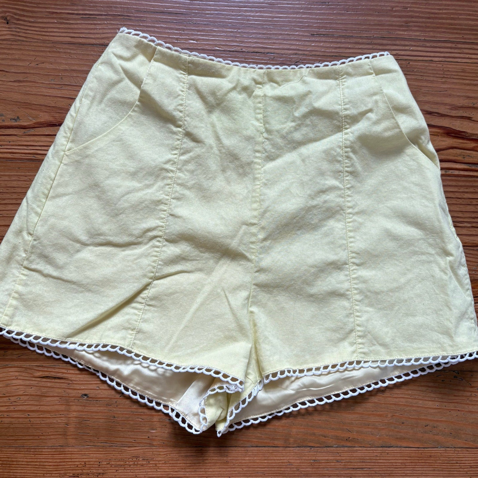 light pastel yellow, white scallop trim, zipper back, high rise, lined, cotton linen blend