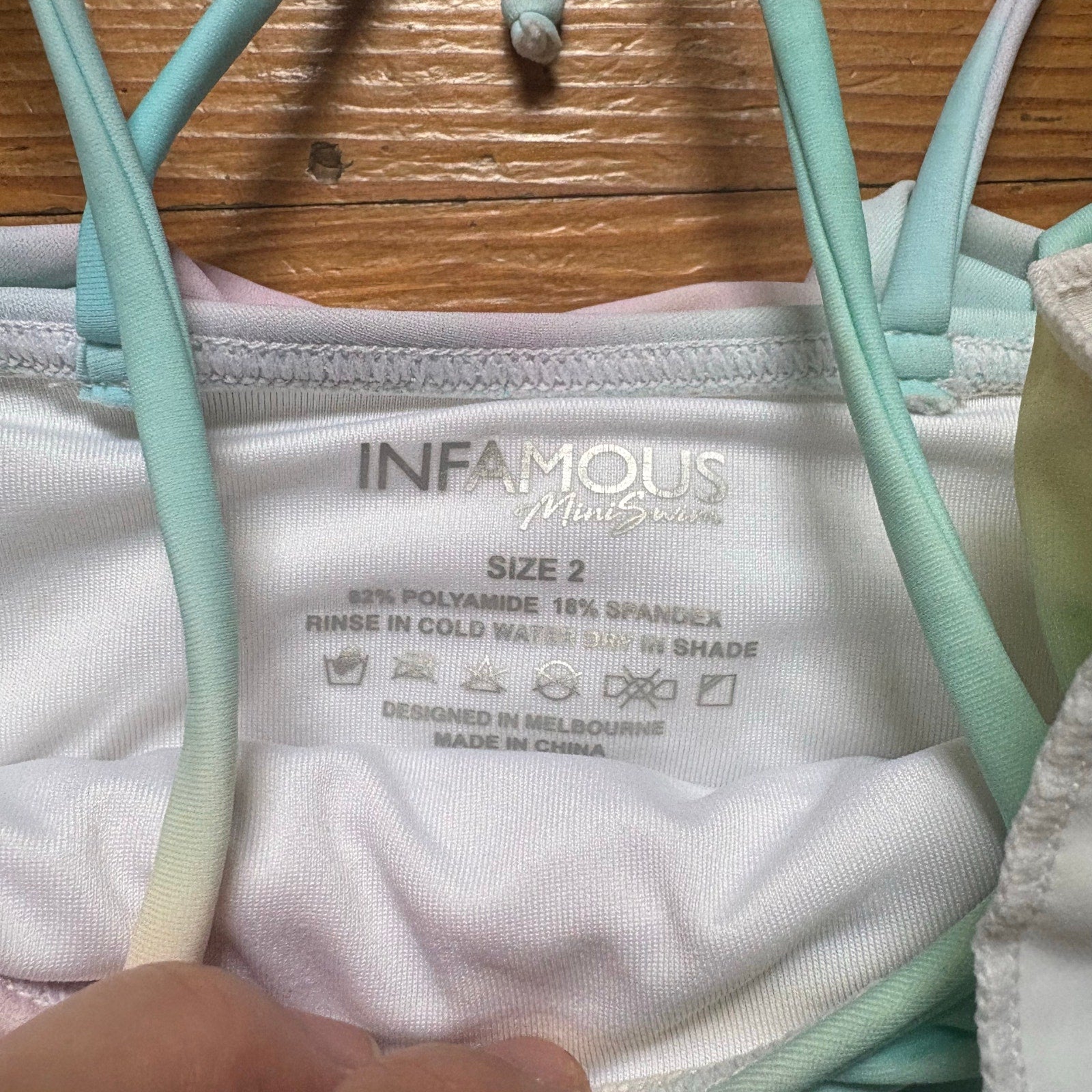 Item: Infamous tie dyed ruffle top two piece toddler swimsuit SIZE 2
