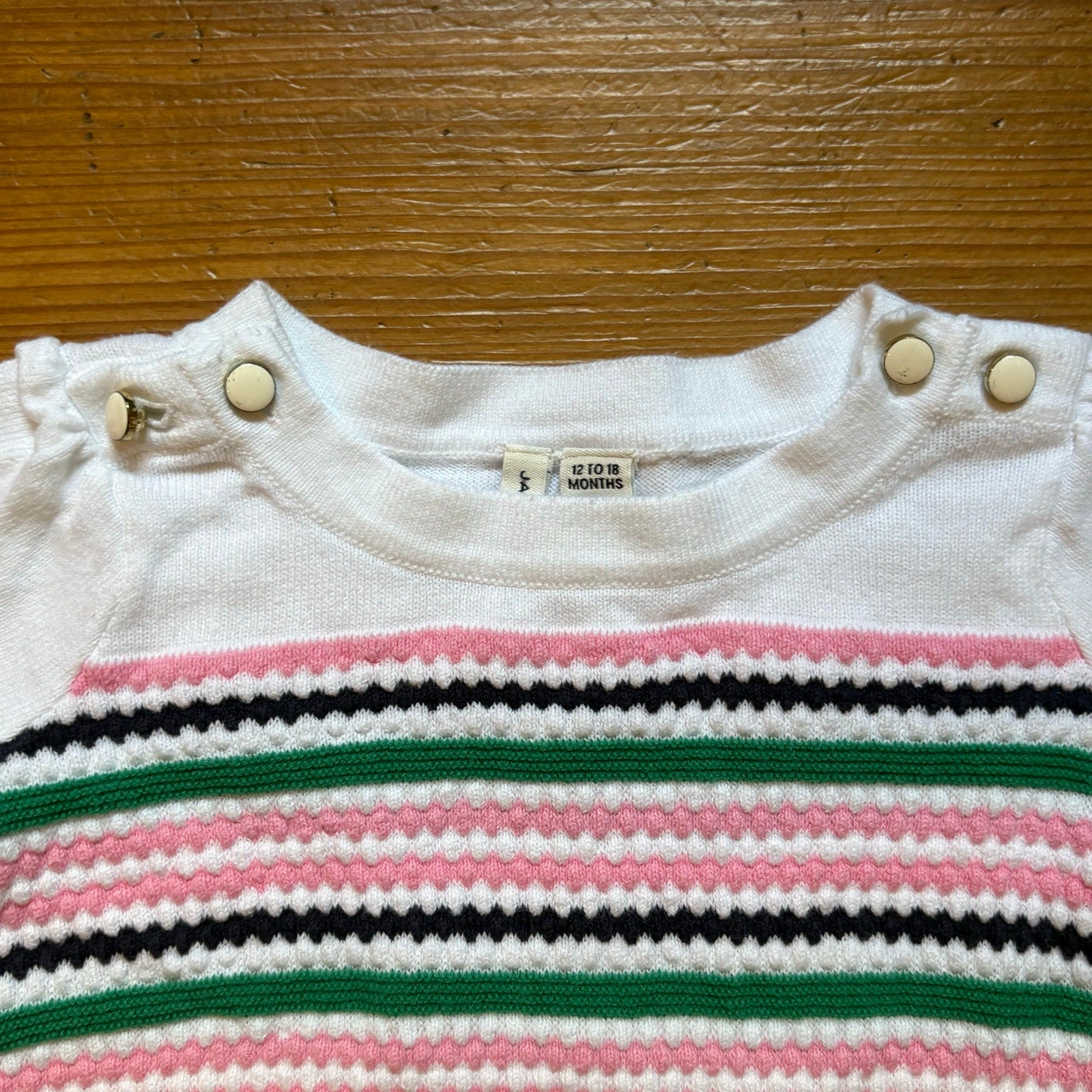 white with pink and green stripes, cotton, quarter sleeve length, gold and white button accents