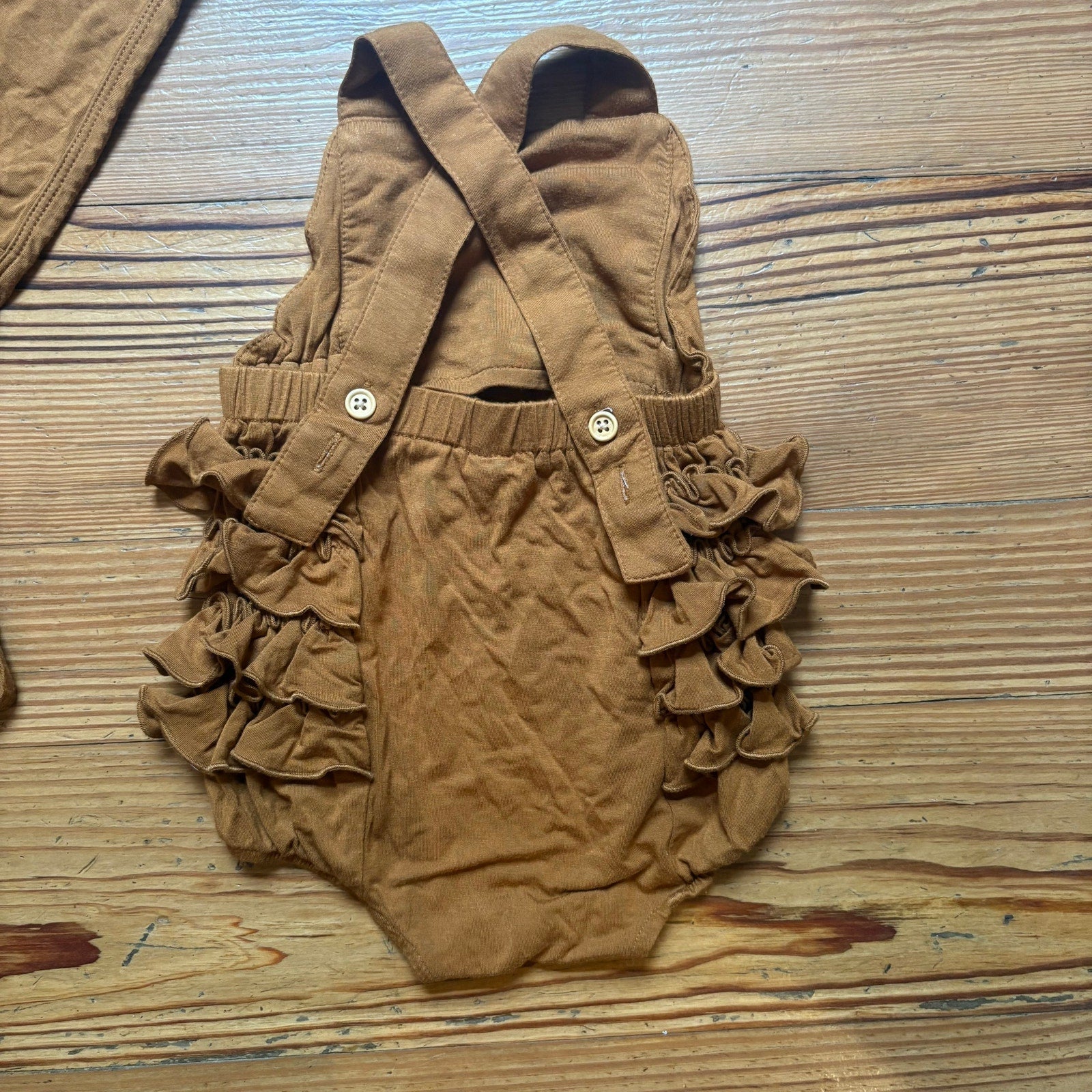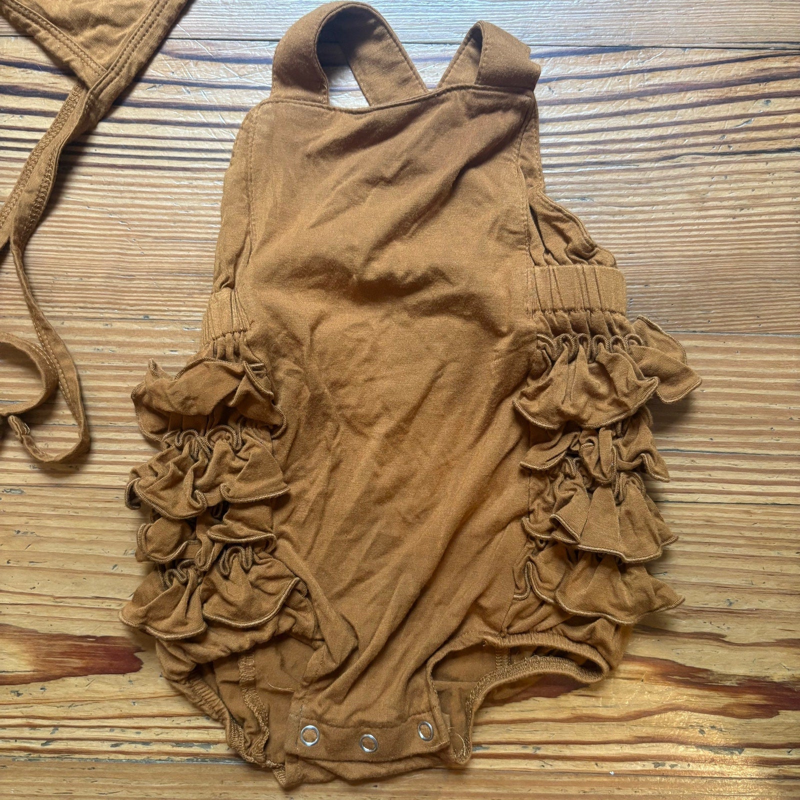 Kate Quinn bamboo brown ruffle bottom overall bubble with bonnet SIZE 3-6M