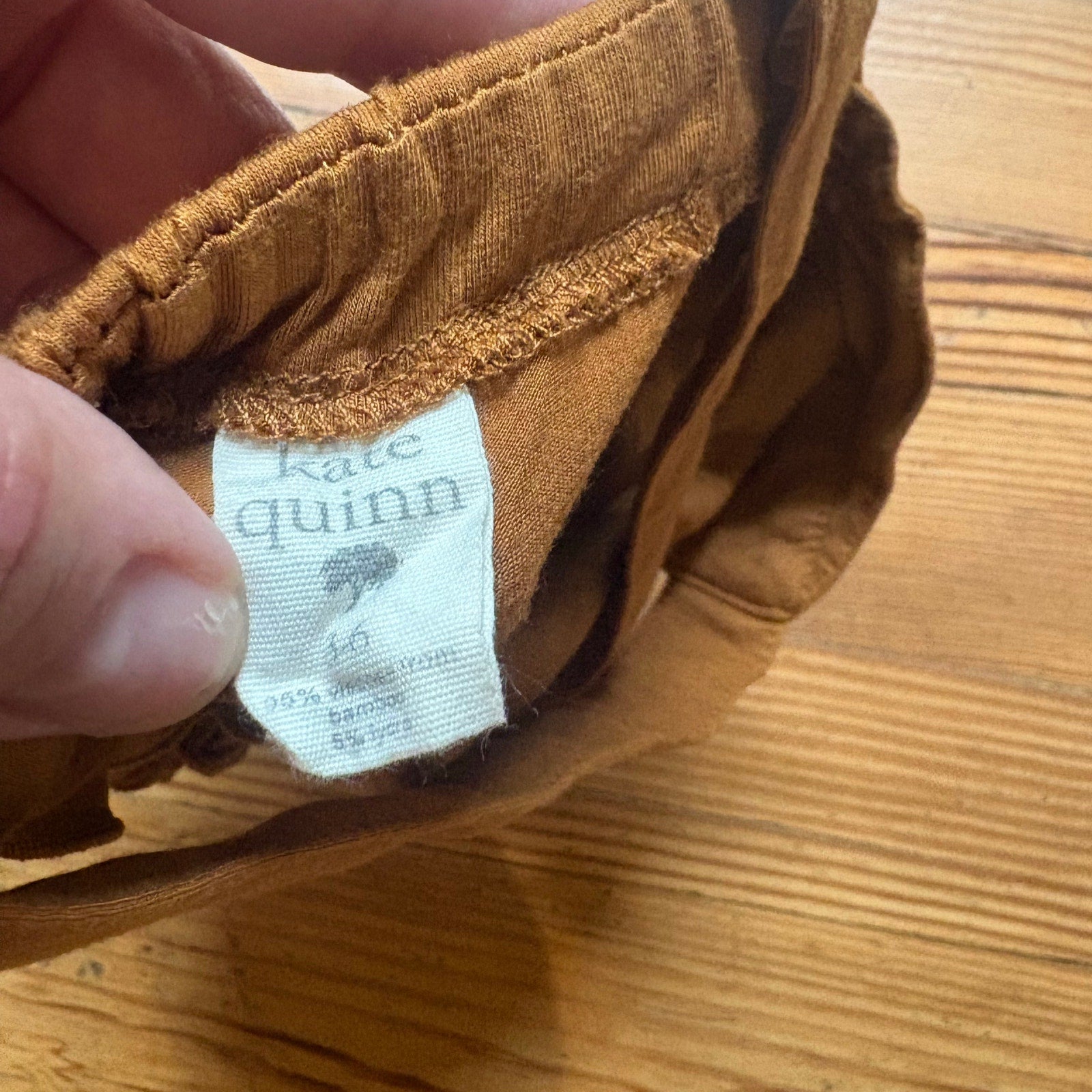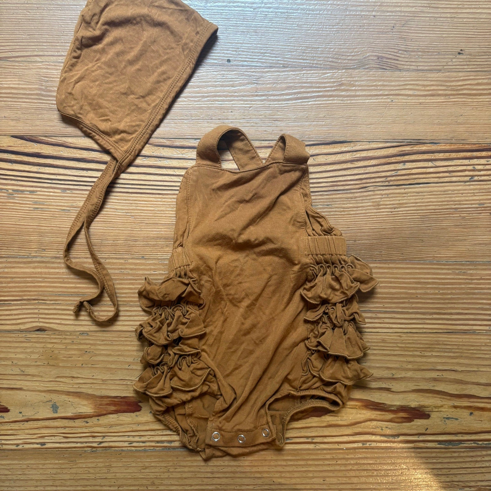 Item: Kate Quinn Organics brown ruffle bottom overall bubble with bonnet SIZE 3-6M