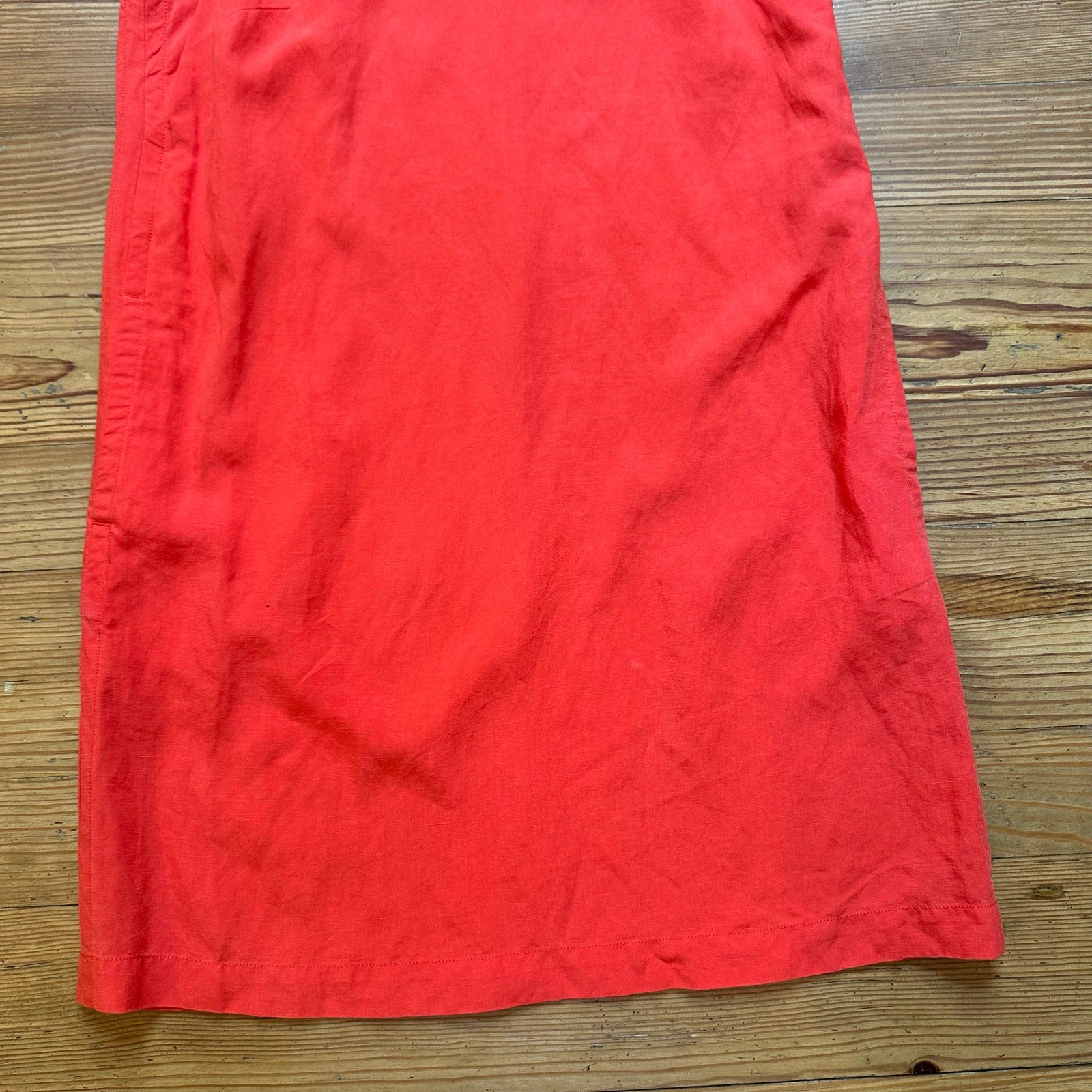bright orange color, overall dress, midi length, linen tencel blend, pockets