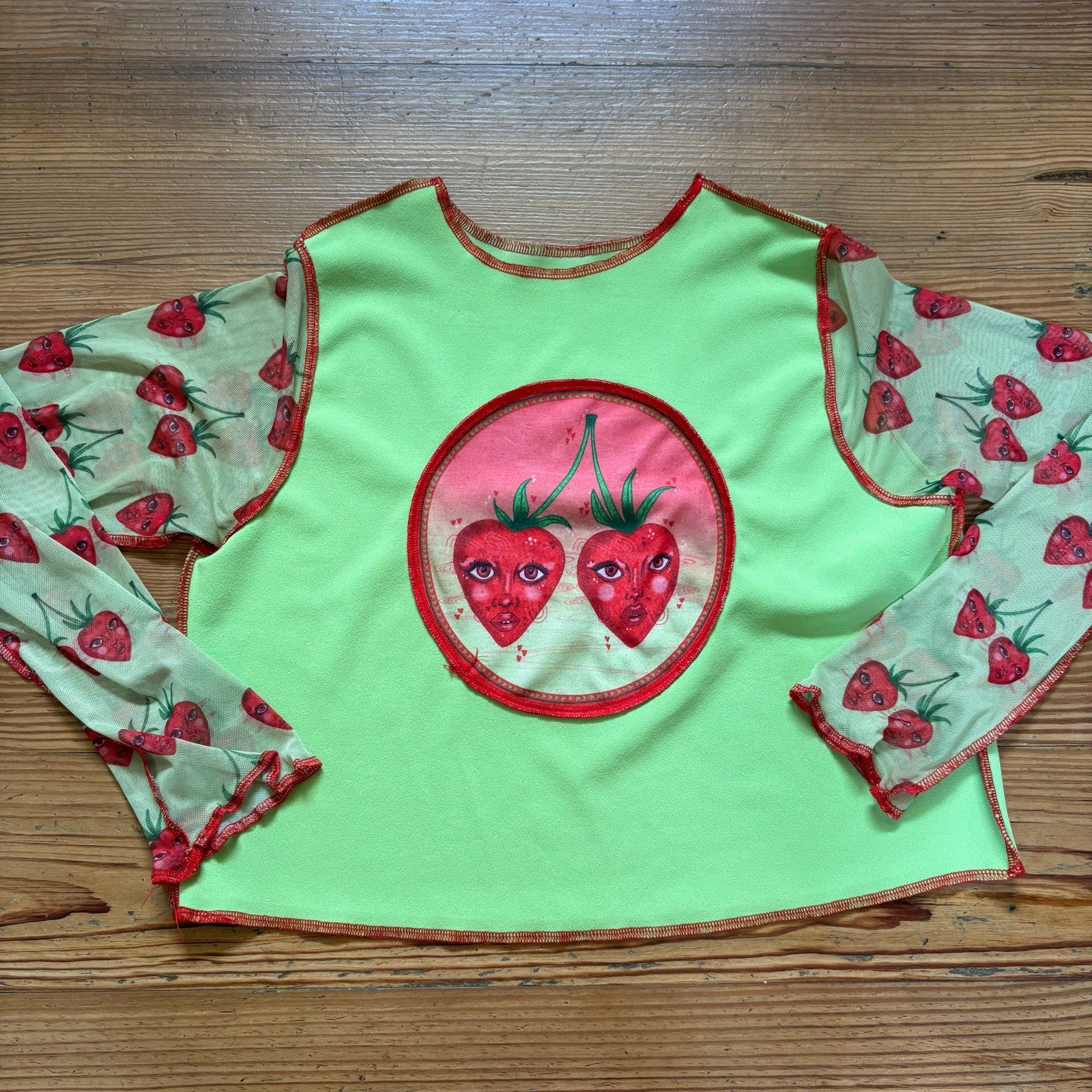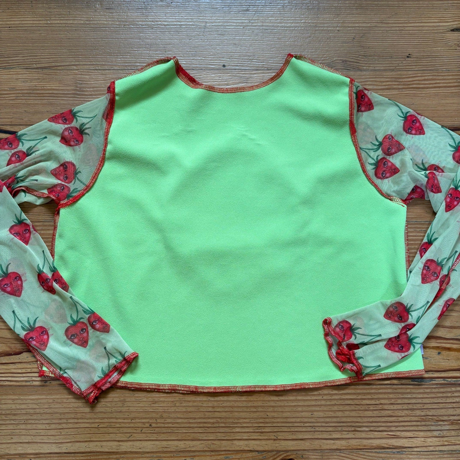 Maddie Page Knitwear lime green red strawberry face sheer sleeve shirt SIZE M