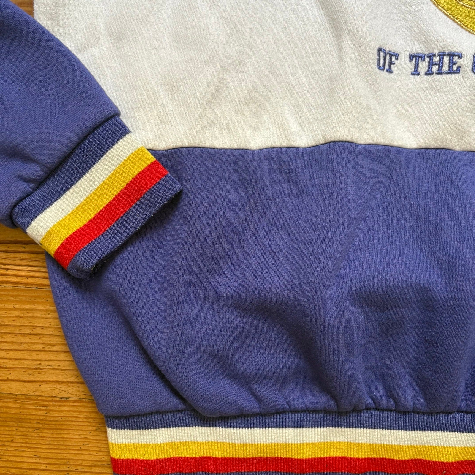 white with colorful trim, blue and gold embroidered graphic, Guardians of the Galaxy, crew, cotton poly