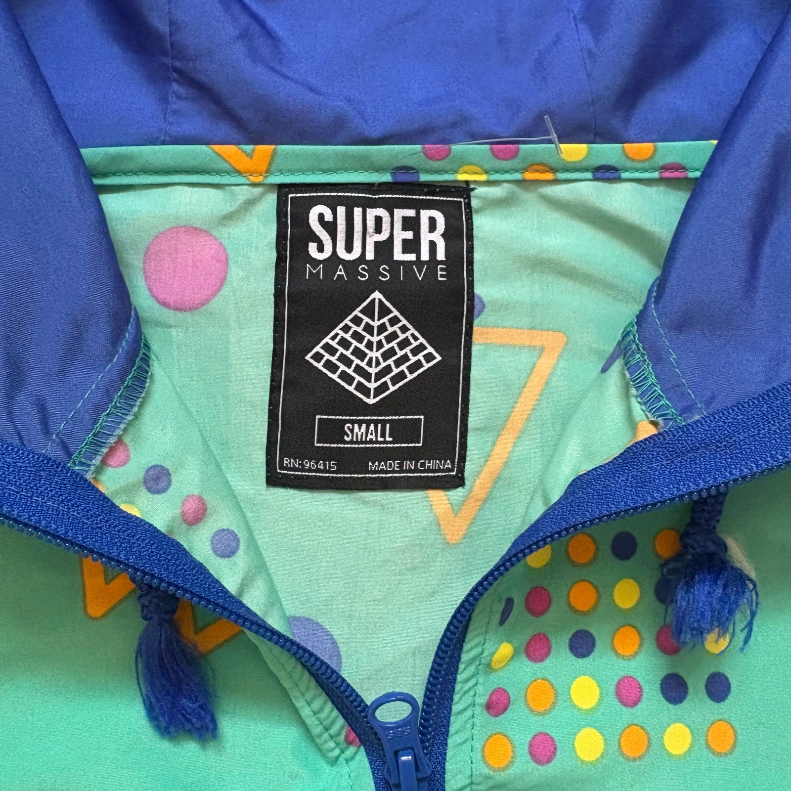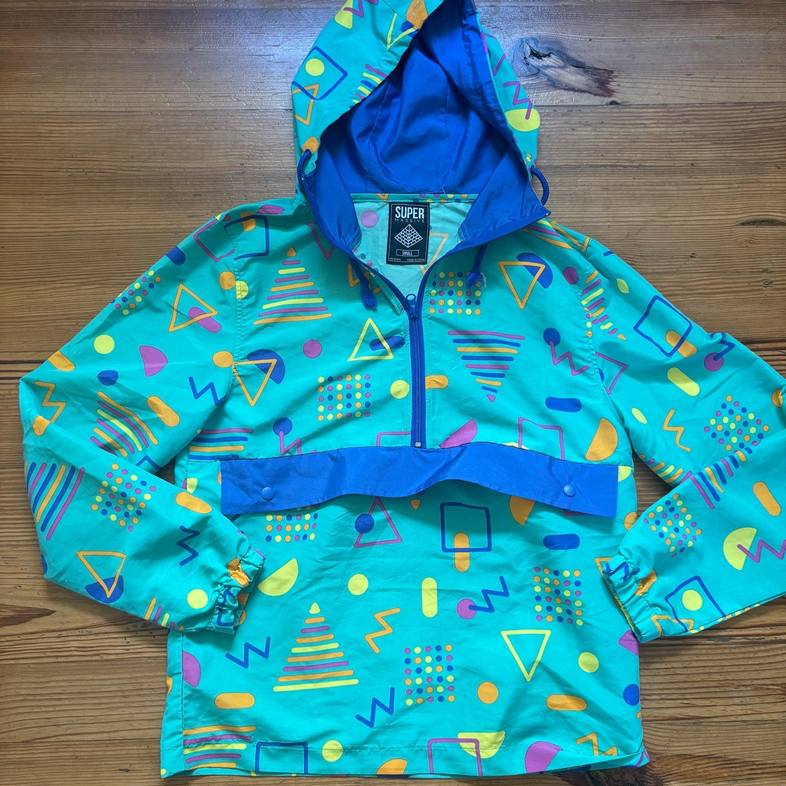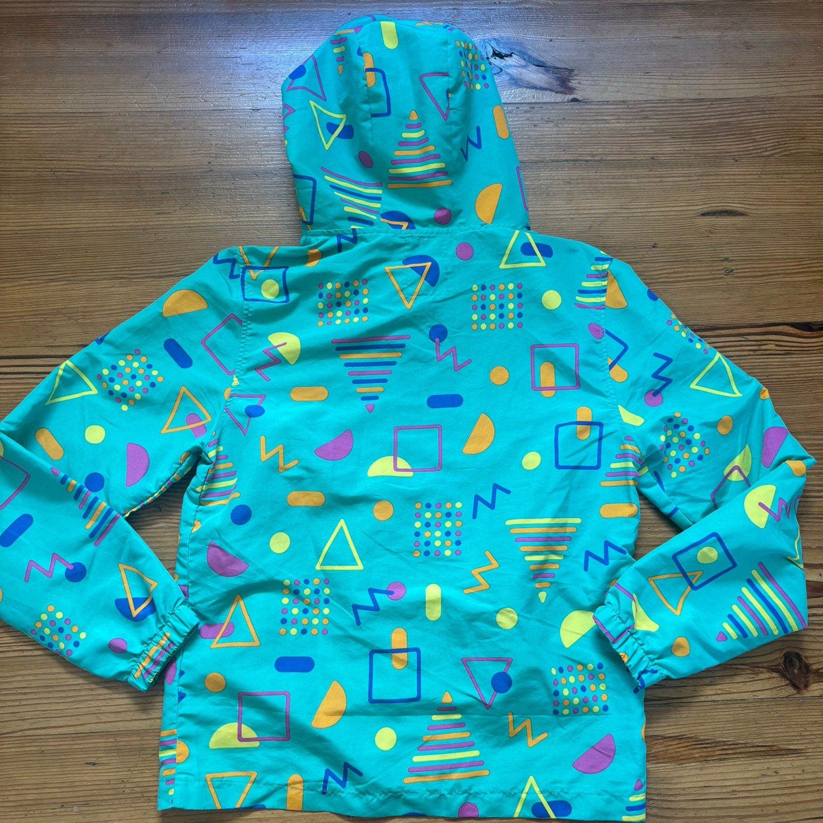 Massive 90s green teal blue shapes hooded pullover adult jacket SIZE S