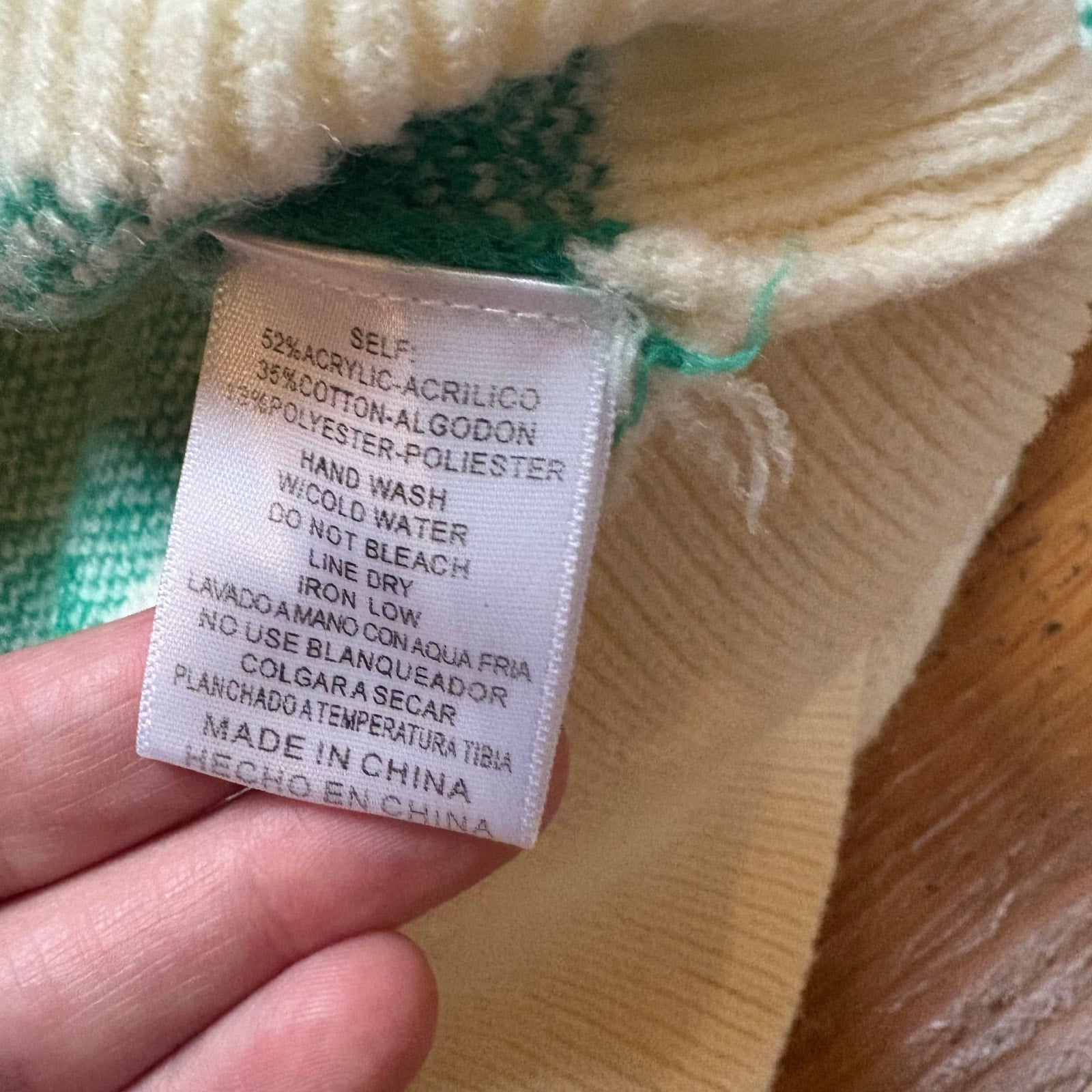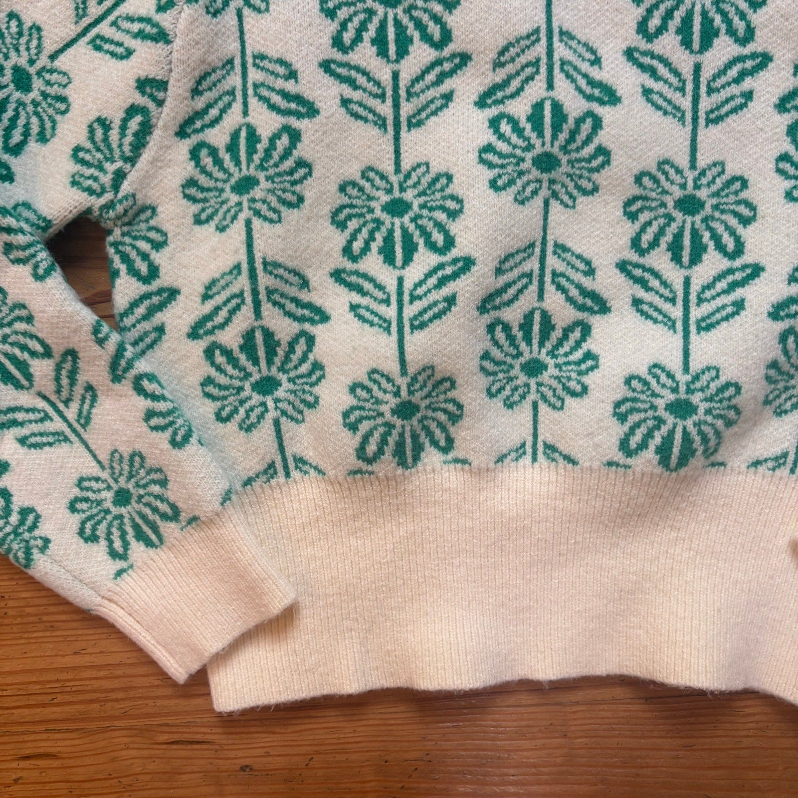 white with green floral pattern, cropped, mock neck, acrylic cotton blend