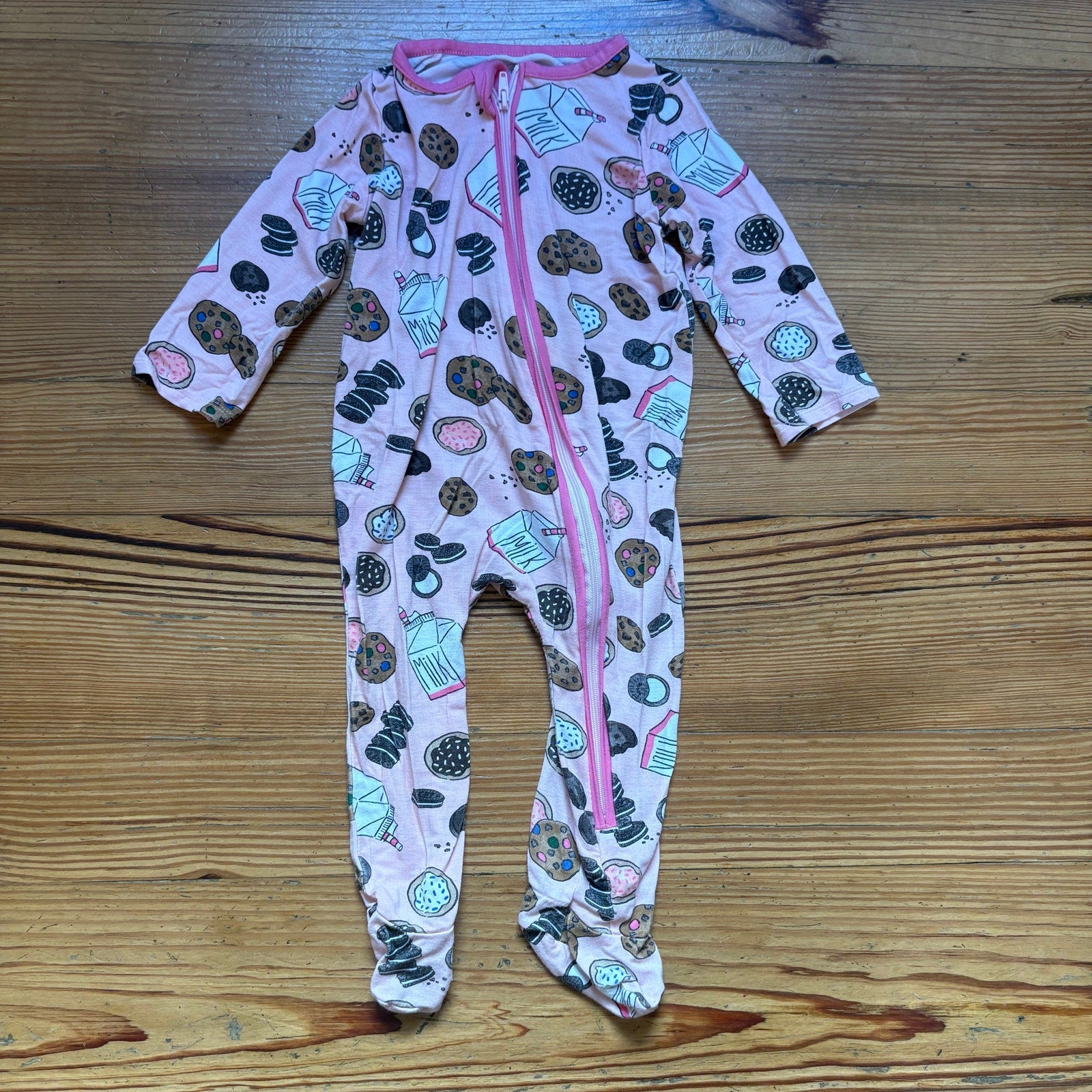 pink with milk and cookie graphics, long sleeve, footed, bamboo