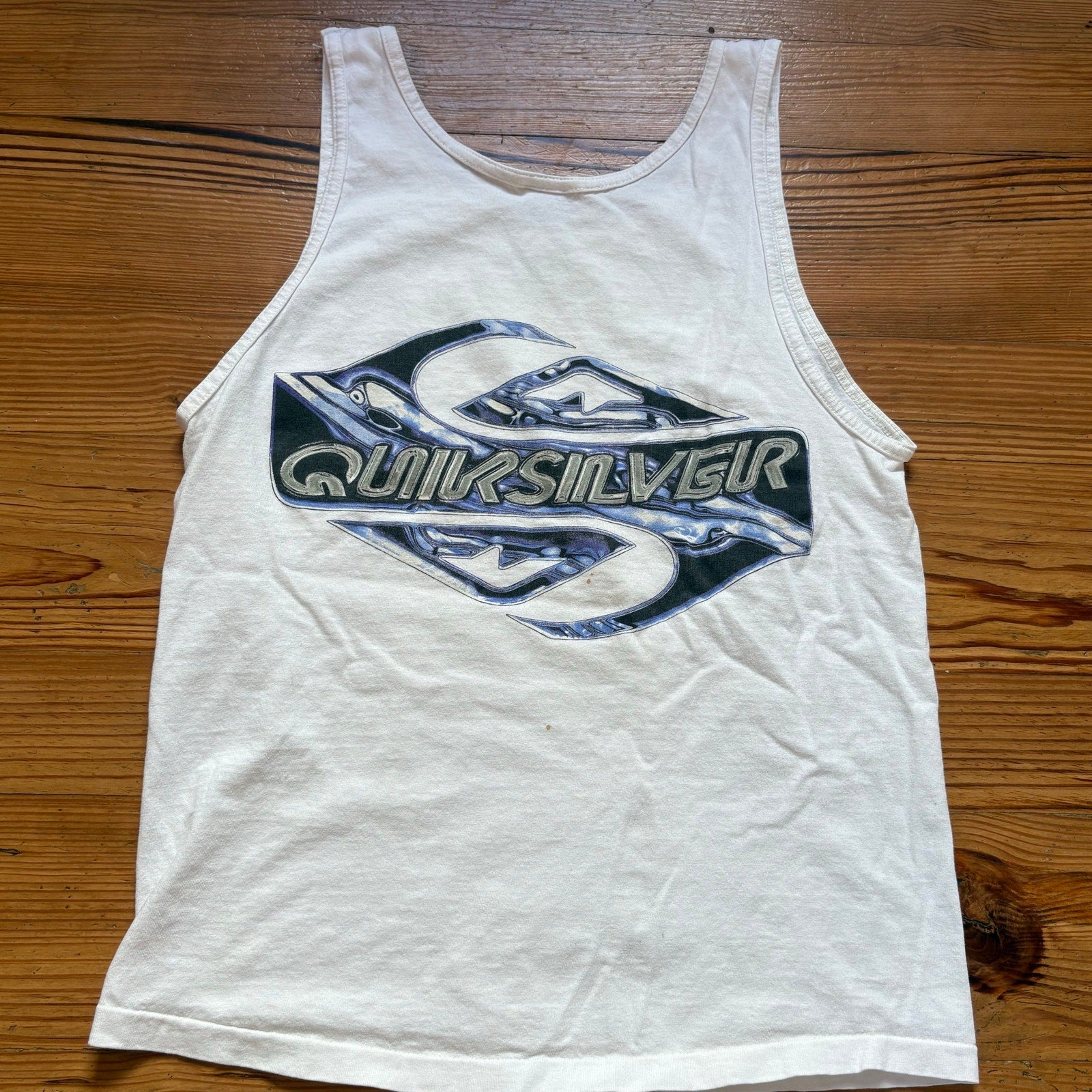 white with quiksilver graphic on the front and back, retro, y2k, cotton