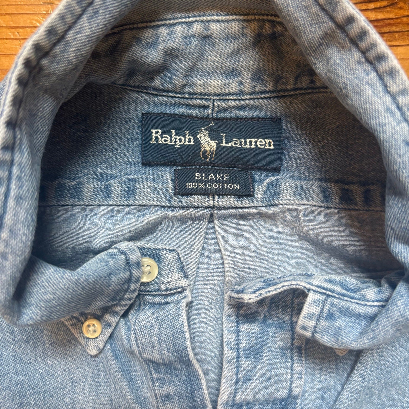 denim blue, long sleeve, cotton, Blake cut, signature on back shoulder