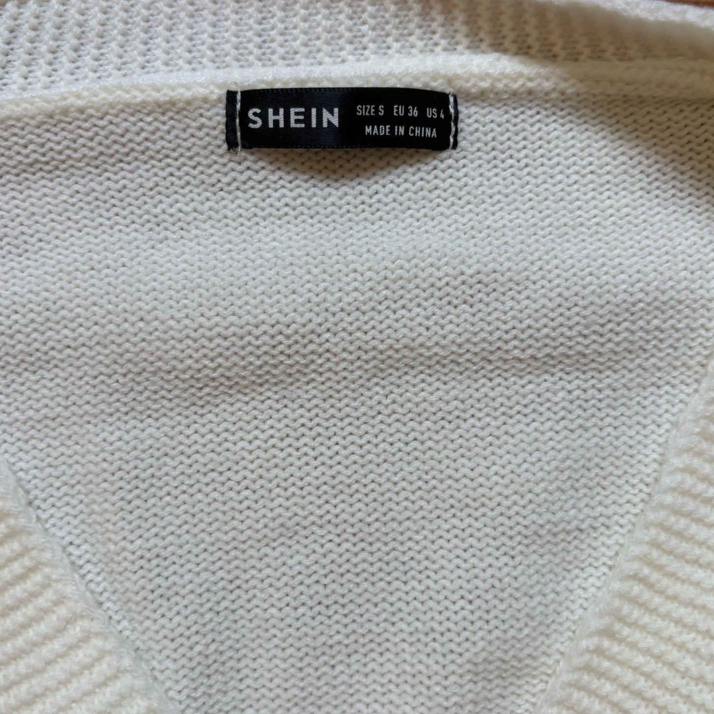 Shein ivory sad teddy bear patches bubble sleeve cropped cardigan sweater SIZE S