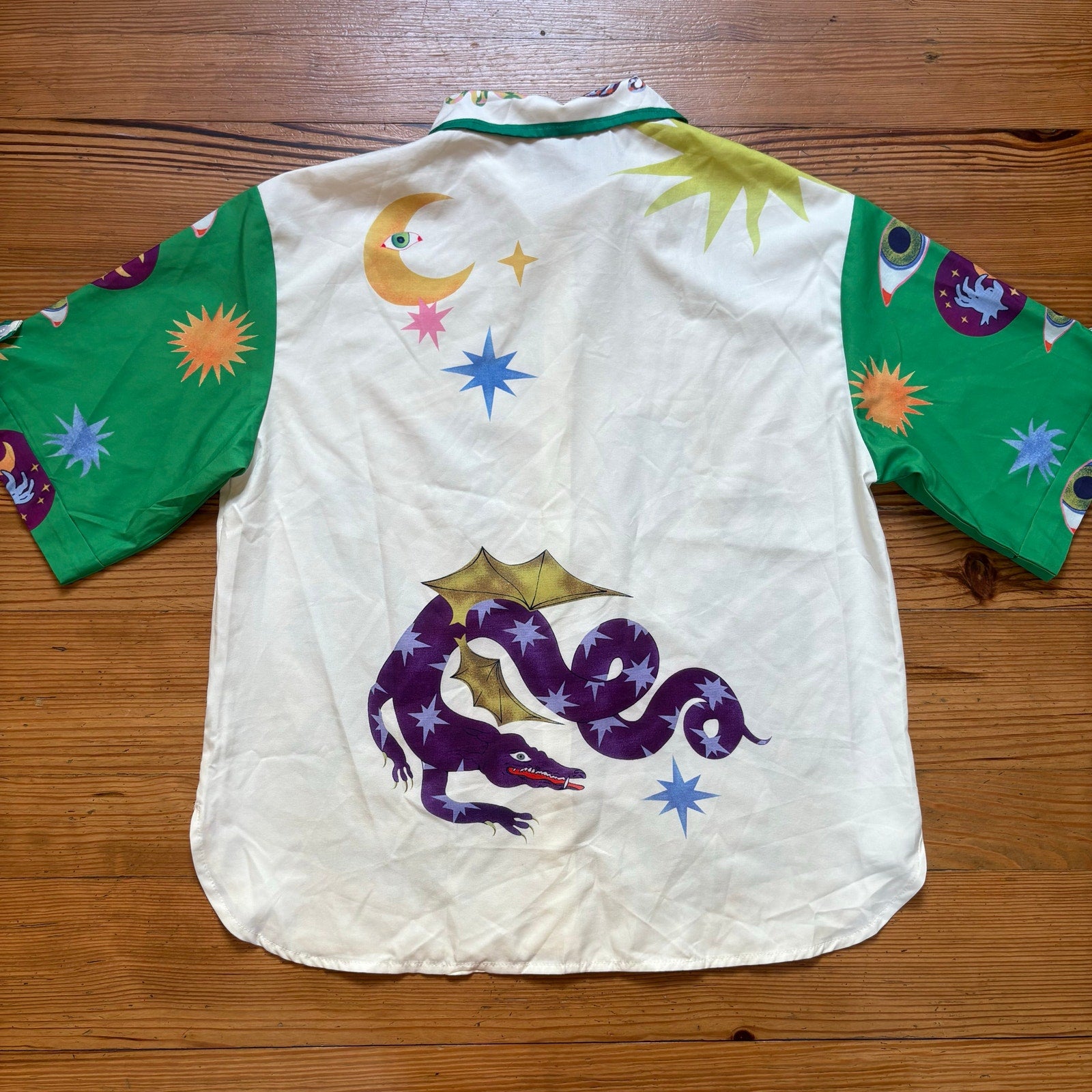 Shein white green dragon sun moon graphic short sleeve button up shirt SIZE L